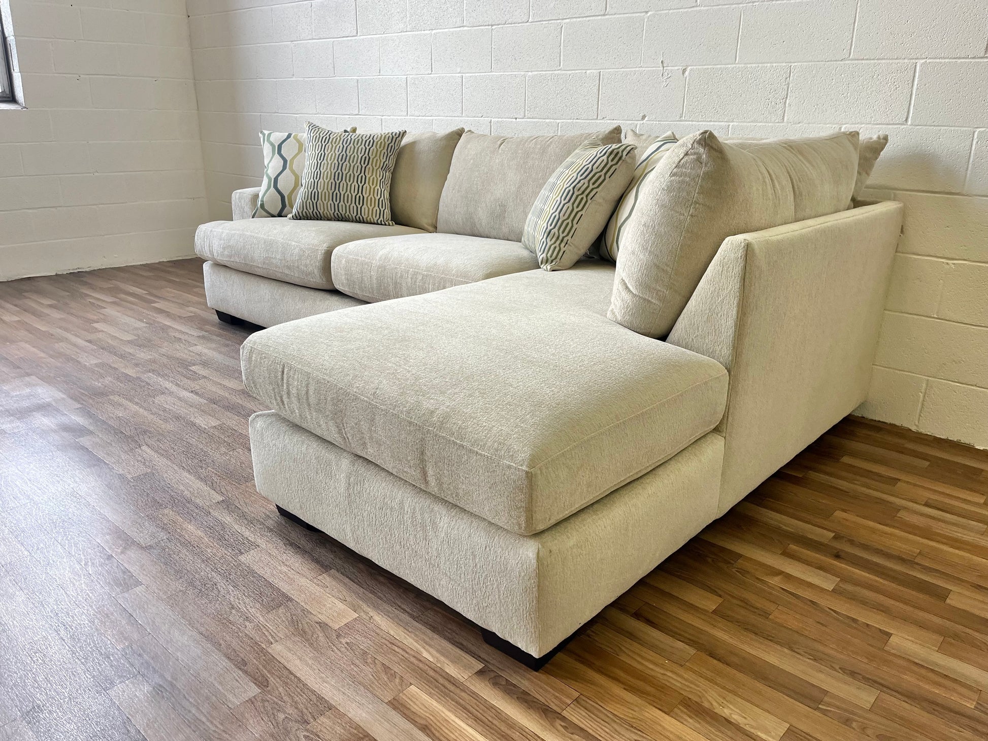 - Spacious cream colored bumper sectional is great for hosting guests or stretching out in style.