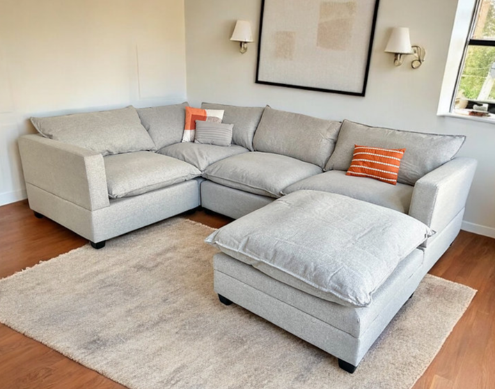 - The ottoman can serve as a free floating piece, connect to one side to form a longer 'L' shaped couch, or can be placed opposite of the armless side to form a 'U' shaped sectional.